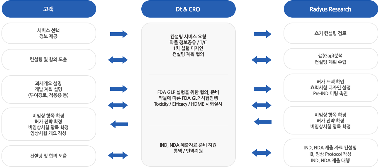 Dt&CRO와 Radyus Research는 2024년 3월 15일 업무협약(MOU)를 체결하여 임상시험용 신약(Investigative New Drug, IND) 승인 및